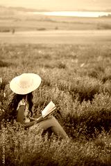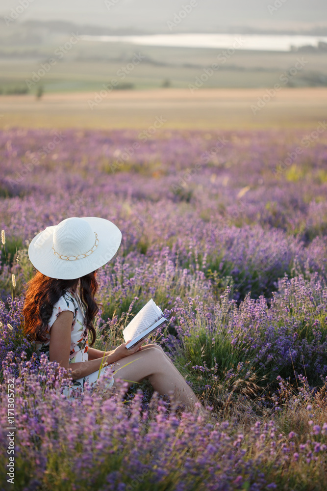 Romantic woman with book on lavender field