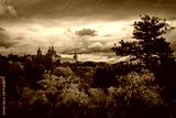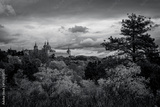 views of the Monastery of El Escorial and its historic gardens surrounded by autumn trees and spectacular skies.