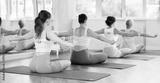 Back view of group of women doing pilates exercises with elastic loop in fitness studio