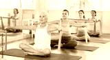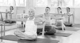 Women of different ages take care of their health - doing Pilates with rubber bands in the gym