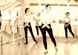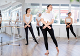 Group of women perform ballet moves in dance class