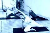 Group of sporty people practicing various yoga positions during training, focus on young female
