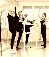 Female visitors of choreographic lesson learn from experienced master of theatrical dance. Students put their foot on machine and work out complex tasks, preparing for performance