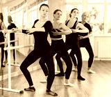 Group of ballerinas preparing for performance, learning and improving quality of rendering stage. Ballerinas near ballet bare repeat grand plie with participation experienced mature female mentor
