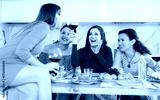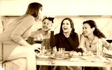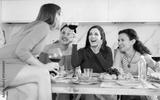 Relaxed adult female friends having fun at intimate house party, sharing stories and laughing gathered around table with wine and appetizers in cozy kitchen