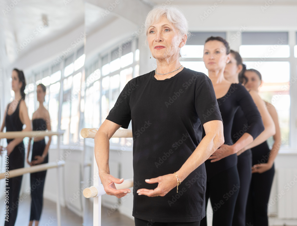 Positive fit gray-haired elderly woman practicing basic classical ballet positions during group training with mixed age female group in modern choreography studio..