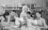 Group of women of different ages sew and draw pattern on paper during sewing master class
