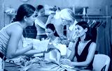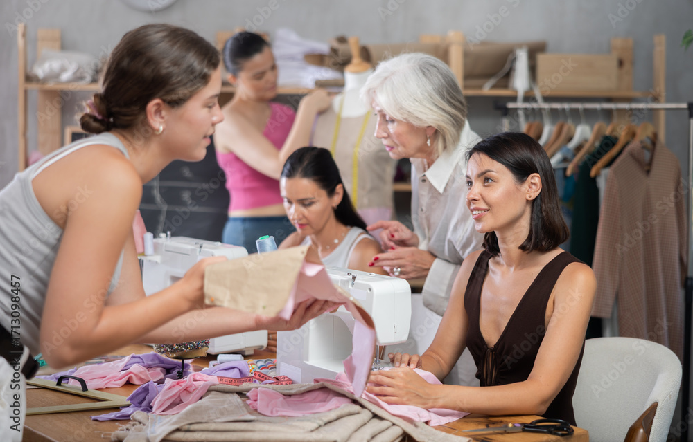 Two women discussing sewn pattern during sewing master class