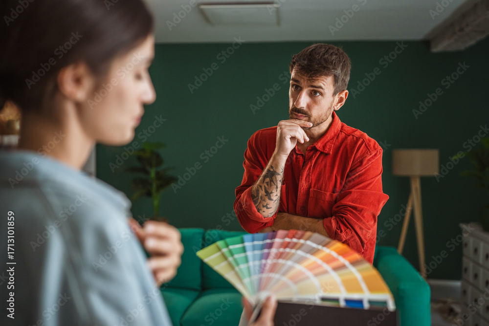 Couple choosing wall paint colors for home renovation