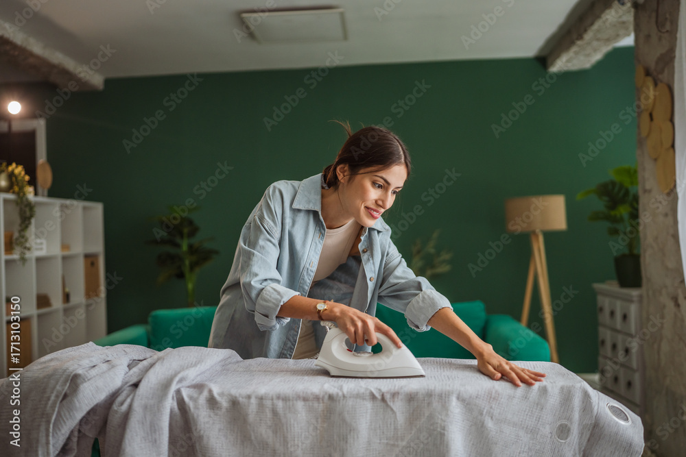 Woman ironing clothes at home, doing household chores