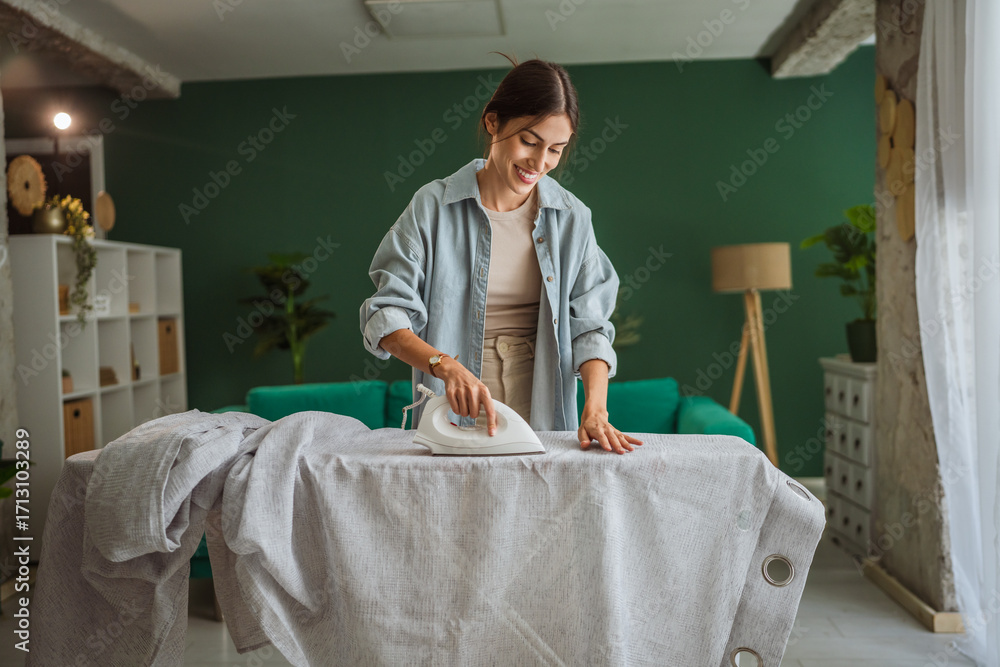 Young woman ironing clothes performing household chore