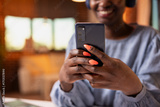 Close up of woman entrepreneur using cellphone at desk, communicating with colleagues from comfort of home. Happy female individual browsing social media, replying to texts during remote work break.