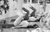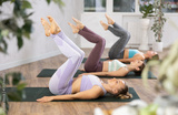 Sports women practicing various yoga poses during a group workout in a fitness center