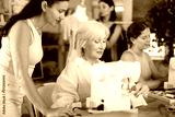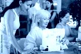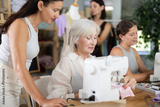 In creative course for adults, enthusiastic mature woman working at sewing machine while other participant friendly chatting, collaborating, fitting garment and preparing fabric..