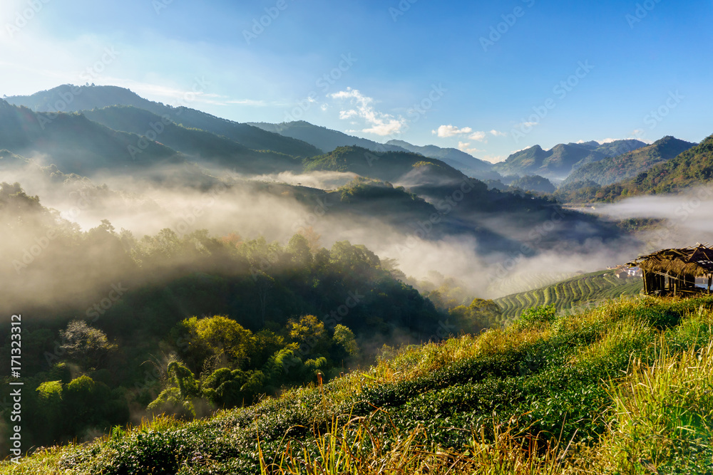 Tea plantation beautiful landscape famous tourist attraction at Doi at Doi Ang Khang, Chiang Mai, Thailand