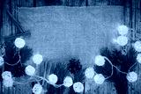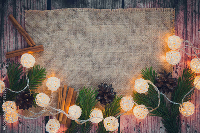 Christmas background - burlap, lighting garland, cinnamon sticks