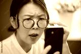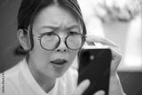 スマホを見る40代の女性 もしかして老眼かな~か、スマホを見て驚くイメージ