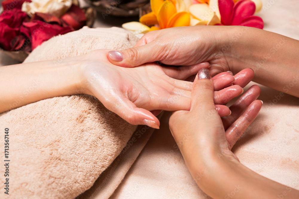 若いアジア人女性はハンドマッサージを受けている。