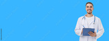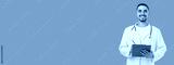 Doctor wearing a white coat stands smiling with a clipboard
