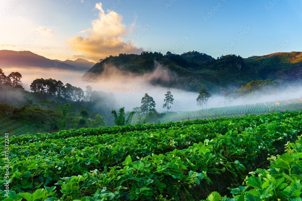 Misty morning sunrise in strawberry garden, View of Morning Mist at doi angkhang Mountain, Chiang Mai, Thailand
