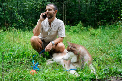 Guy squats and talks on his phone while a brown and white Husky dog lies on the grass. They are in a forest on a summer day. A ball lies next to the man