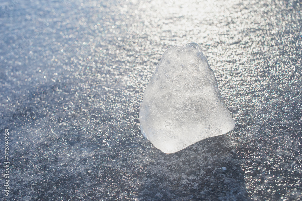 Natural ice crystal cube on frozen river outdoor. Wild north nature, global warming, arctic glacier melting and climate change concept.