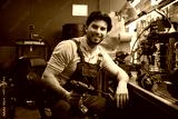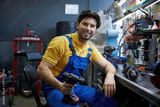 A man worker sits comfortably in a chair, holding a drill and smiling
