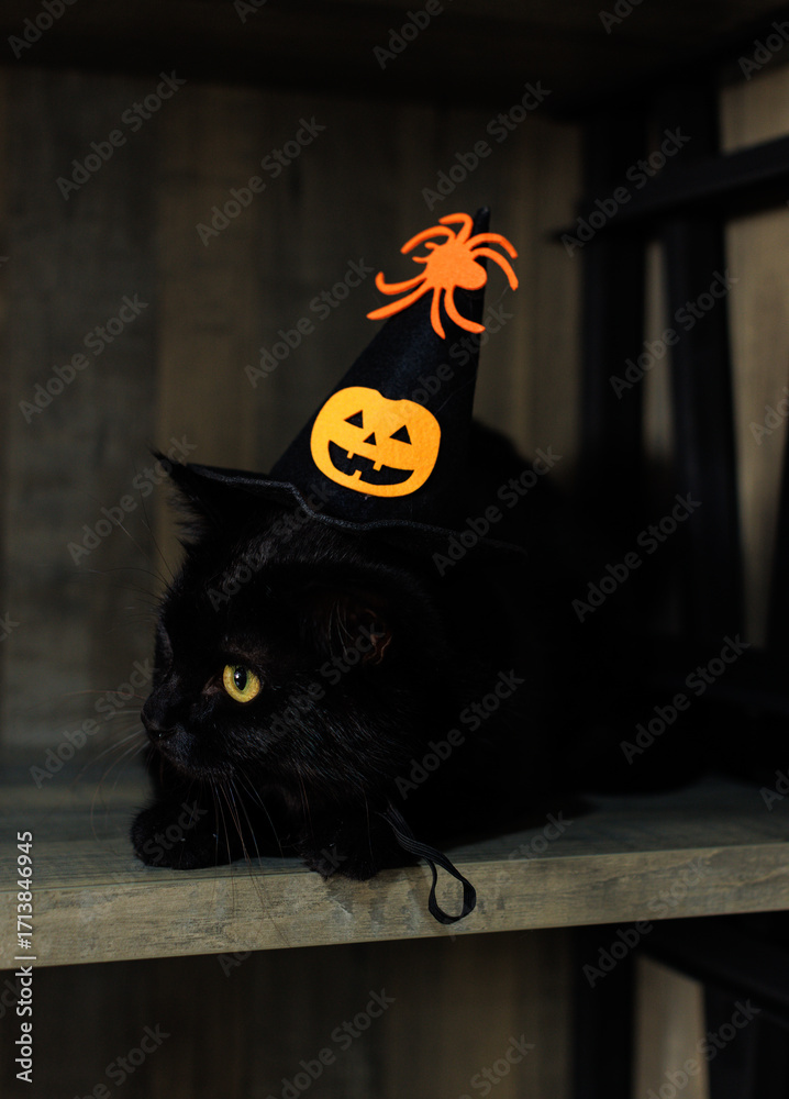 Portrait cute black cat with yellow eyes wearing hat orange spiders and pumpkin for Halloween, lying on shelf dark background. Pet in wizard happy funny moments friendly carnival holiday celebration.