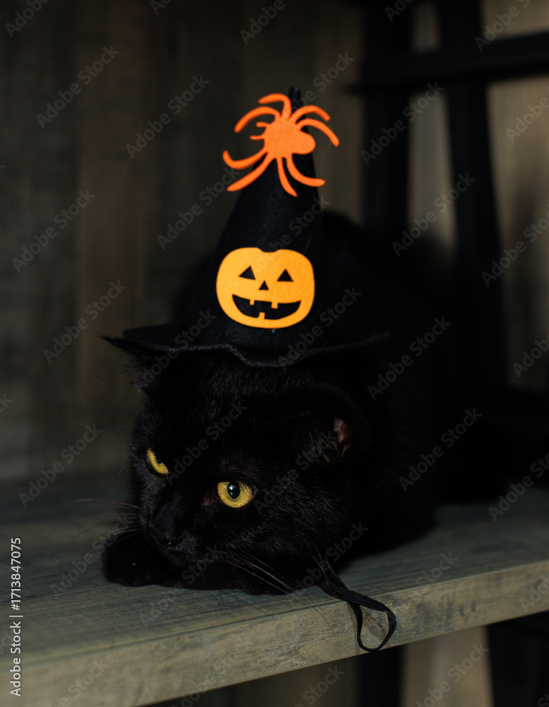 Portrait cute black cat with yellow eyes wearing hat orange spiders and pumpkin for Halloween, lying on shelf dark background. Pet in wizard happy funny moments friendly carnival holiday celebration.