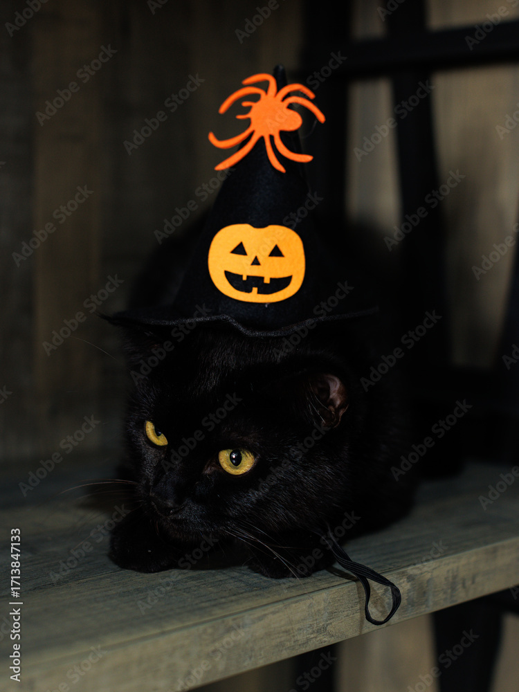 Portrait cute black cat with yellow eyes wearing hat orange spiders and pumpkin for Halloween, lying on shelf dark background. Pet in wizard happy funny moments friendly carnival holiday celebration.