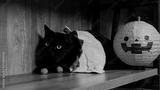 Portrait of cute black cat with yellow eyes in dressed up with funny pumpkin costume for Halloween, lying on shelf dark with props background. Pet in wizard friendly ghost carnival holiday celebration