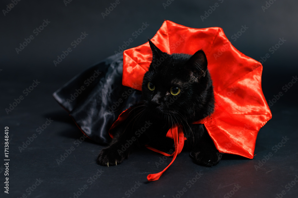 Portrait of cute black cat with yellow eyes in vampire costume for Halloween, sitting lying on dark background. Pet in wizard, Happy funny moments, friendly ghost carnival holiday celebration concept.