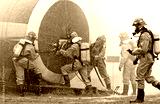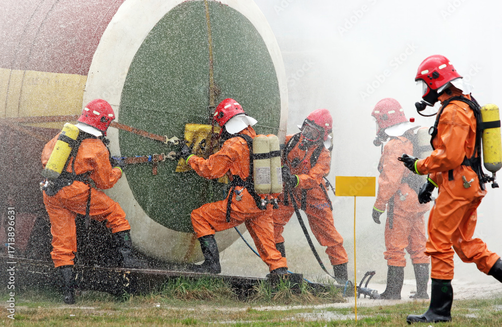 Firefighters practice emergency response techniques on a simulated training exercise at a safety facility