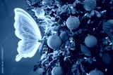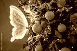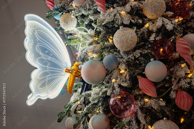 Enchanting Christmas tree featuring a glowing butterfly, frosted branches, pastel baubles, and warm lights. A whimsical holiday display, perfect for festive winter celebrations and seasonal designs.