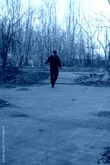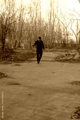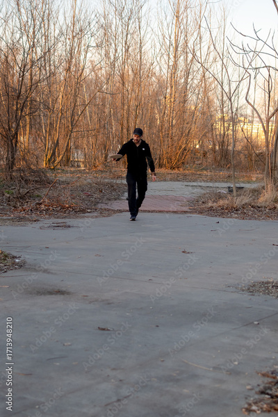 Man enjoying a game of disc golf on a concrete path, surrounded by bare trees in the warm light of golden hour. Captures outdoor sport, leisure, and a calm, wintry atmosphere.
