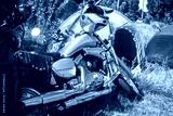 Chrome motorcycle with helmet parked next to camping tents in a sunny outdoor setting, embodying freedom and adventure of a biker road trip and camping lifestyle.