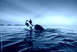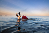 Determined man pulls a large, textured red object through tranquil water at sunset, creating splashes. A powerful image of strength, perseverance, and outdoor effort against a beautiful sky.