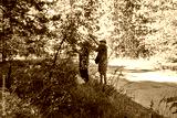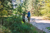 Couple exploring dense forest vegetation along an old concrete road on a sunny day. Capturing the tranquility of nature and the spirit of adventure in a secluded woodland.