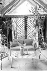 rustic greenhouse reading nook with tropical foliage for concepts of comfort serenity and eco-friendly interior