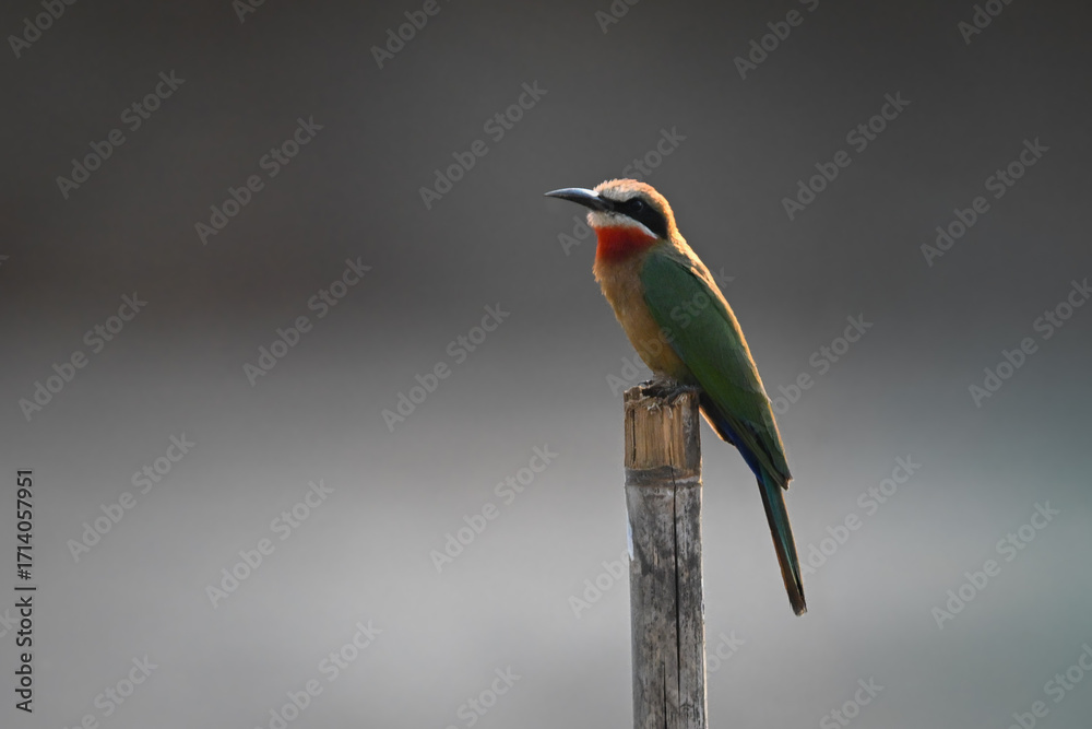 White-fronted bee-eater in profile on bamboo pole