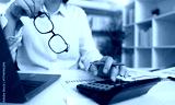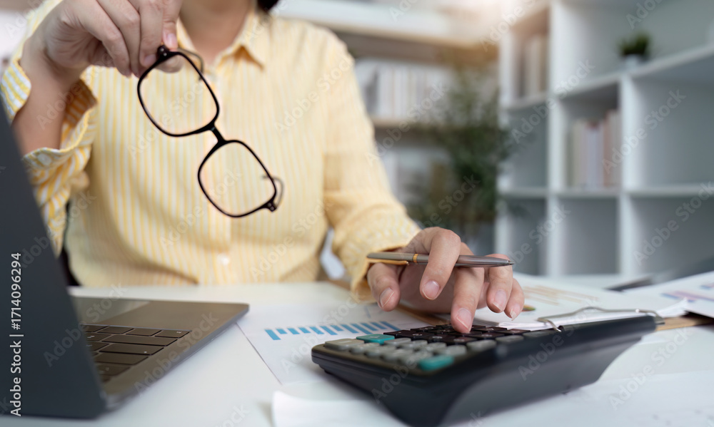 Financial Analysis. Professional accountant reviewing reports with calculator and laptop.