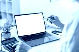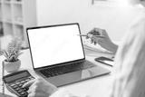 Remote Work. Professional presenting data on laptop in a modern office.
