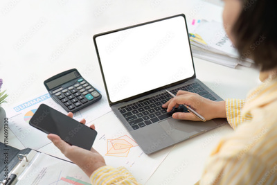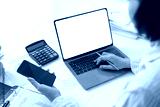 Remote Work. Professional woman analyzing financial data on laptop and calculator.