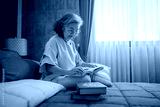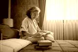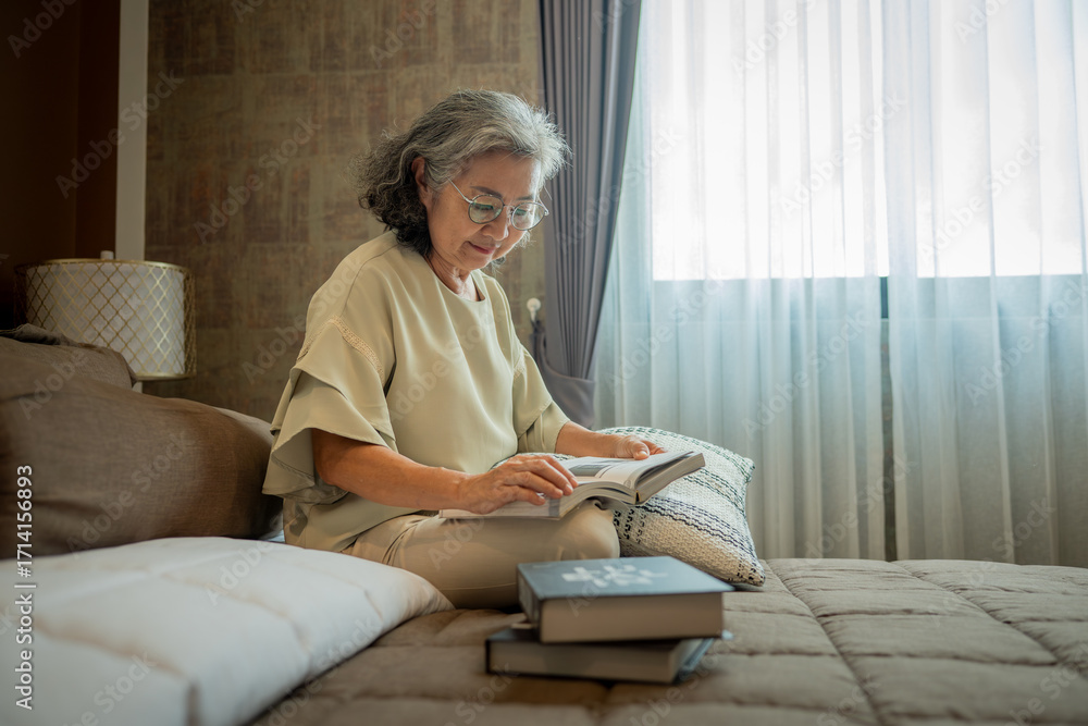 Elderly woman reading book appears calm and relaxed, enjoying a peaceful related to aging gracefully, relaxation, knowledge, retirement lifestyle, wellness, and peaceful living at home.