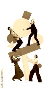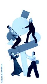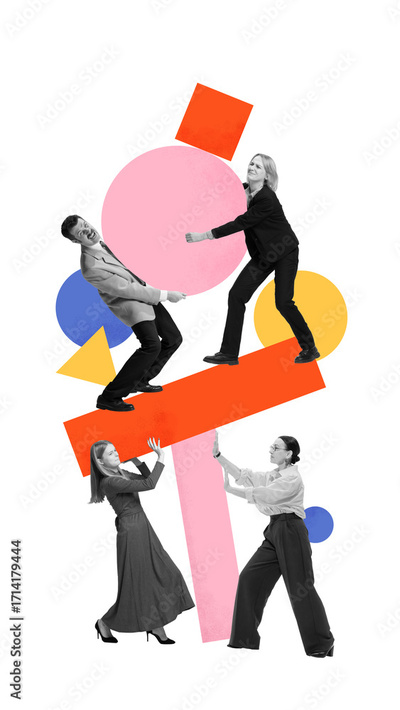 Bold colorful poster. Team of people balancing abstract geometric shapes symbolizing cooperation. Concept of business teamwork, social collaboration, education and creative industry communication.