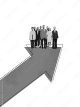 Contemporary collage. Business team standing on red arrow symbolizing growth and corporate strategy