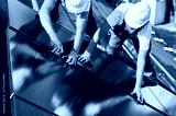 Workers building solar panel system on rooftop of house. Two men installers in helmets installing photovoltaic solar module outdoors. Alternative, green and renewable energy generation concept.