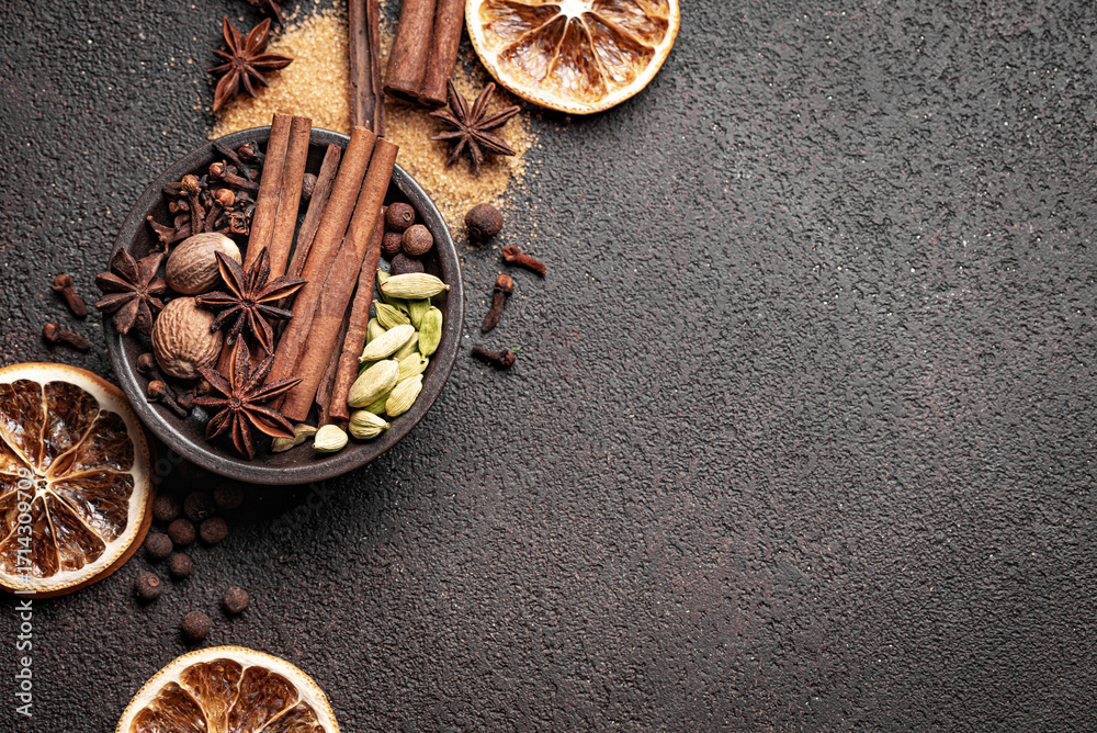 Christmas spices. Seasonal winter spices for mulled wine.