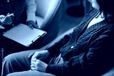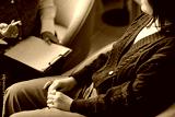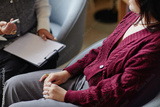 Caucasian young adult woman sitting in chair holding hands together while talking to therapist holding clipboard and pen during counseling session in office setting