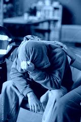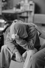Teenager boy with hood covering head sitting with face in hands, receiving comfort from multiethnic group with supportive hands on shoulder and back, emotional support concept